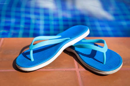 Beach slippers on border of a swimming pool - holiday tropical concept
