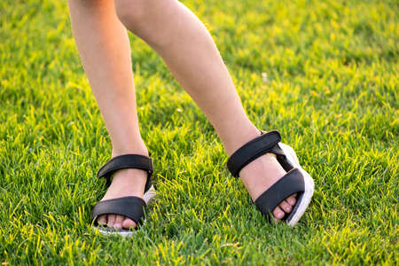 Closeup of young child girl legs standing on green grass lawn on warm summer evening.
