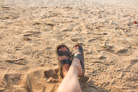 The sea on the beach, slippers, feet in sandals on the background of beach sand. travel holidays concept. High quality photo