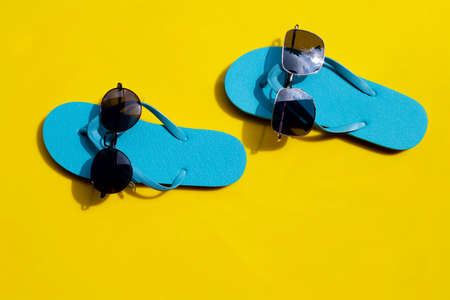Blue flip flops with sunglasses on yellow background. Enjoy summer holiday concept.