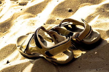A beach sandal in the sand, on the beach, close-up. Happy kids on beach holidays.