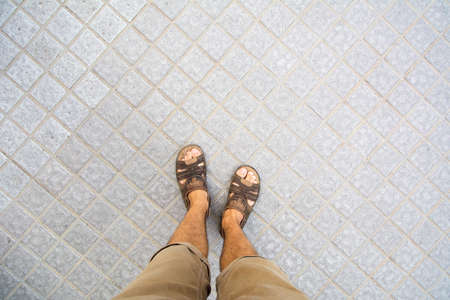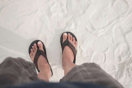 Close up of man in black slippers feet standing at the beach, with a wave of foaming gentle beneath them.Top view