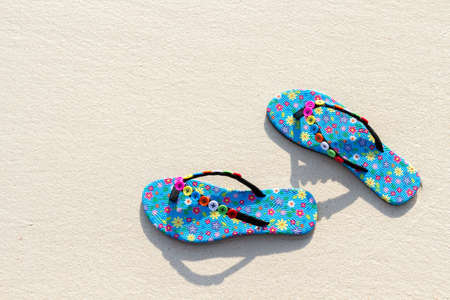 flip flops with gradient color on beach sand with palm tree shadow and space for text. summer time. 3d render