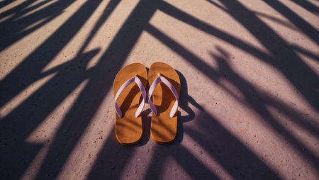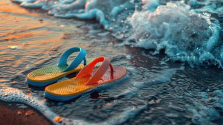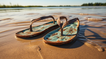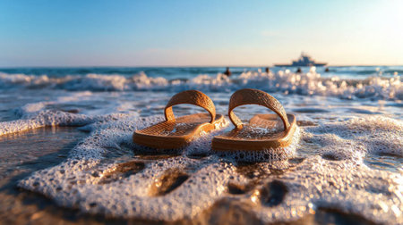 A pair of flip flops rests on the sandy beach, with waves crashing nearby. The tranquil scene is a perfect blend of water, wind, and natural landscape AIG50