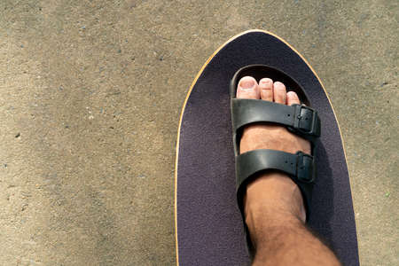 men's feet In sandals, stepping on a black Surf Skate on the sand in the park.