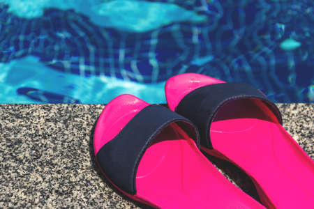 Summer background with slippers for the pool fuchsia colors near the pool.