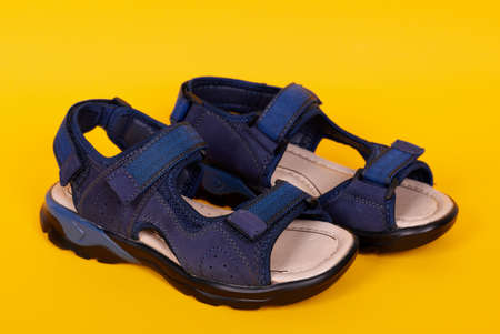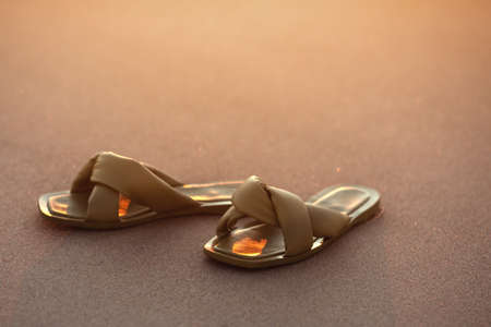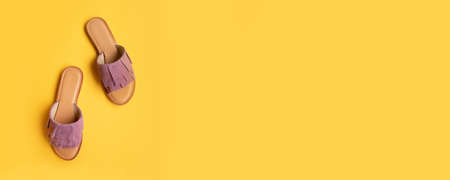 Leather sandals on yellow background. Woman casual summer vacation outfit, flat sole sandals