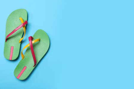 Flat lay composition with flip flops and seashell on colored background. Space for text view.