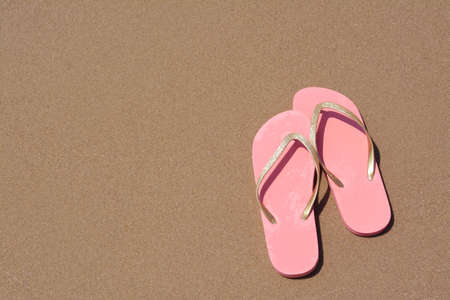 Brown flip flops on the sandy beach in Cha am, Thailand. Space for text in template, Top view.