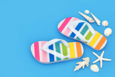 Rainbow striped flip flops on blue background with seashells. Trendy summer footwear for beach holiday vacation and LGBT themed concept. Copy space, top view.