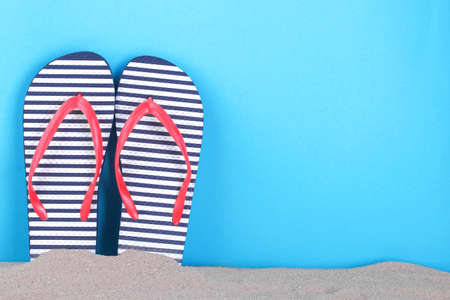 Flip flops in a white and blue strip in the sand on a blue background with a place for an inscription