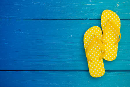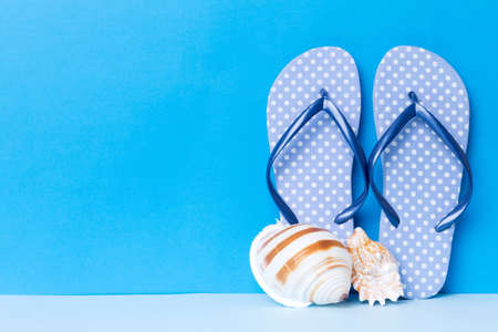 Beach flip-flops on blue wooden background. Summer vacation and travel concept concept