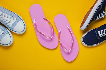 Lot of pairs of shoes on yellow background. Minimalistic fashion concept.
