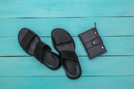 Feminine leather black sandals and wallet on blue wooden background. top view