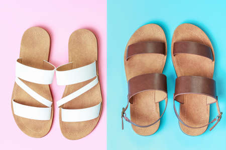 Women's white leather sandals on a blue background. Minimal concept of summer women's shoes. flat lay.