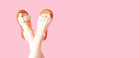 Female legs with white pedicure in summer brown sandals on pink background, copy space.