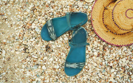 Straw hat and sandal on beach. Top view summer accessories on seashells texture. Tropical summer vacation concept
