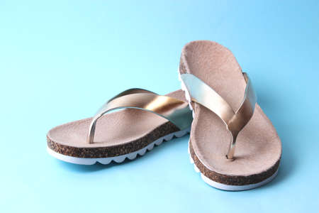 Woman bright flip-flop close up. Female rubber slippers isolated on blue background.