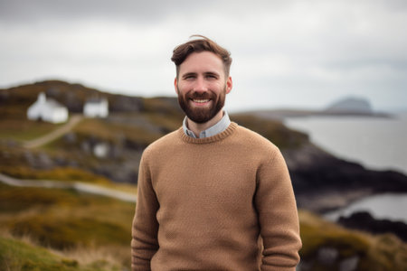 Portrait of a handsome young man with a beard wearing a sweater standing in front of a house on the Isle of Skye in Scotland