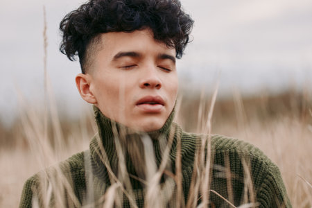 A young man in a heavy knitted sweater closes his eyes amid tall dry grasses, conveying an authentic and truthful moment of quiet introspection and a natural, unposed outdoor portrait mood.
