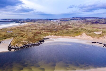 Silver Strand Beach; Co donegal; Ireland, April 2019. An idyllic Donegal beach surrounded by green mountains seen from above