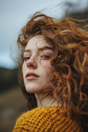 Close-up portrait of a beautiful red-haired girl with freckles in a yellow sweater