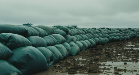 Dark green sandbags stacked in a long, winding line, forming a protective barrier on damp, muddy ground. overcast sky above, suggesting a need for flood defense.