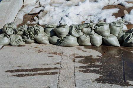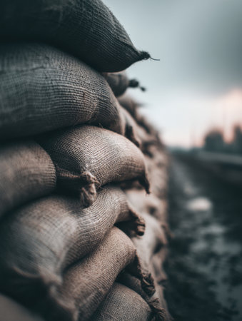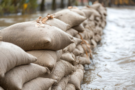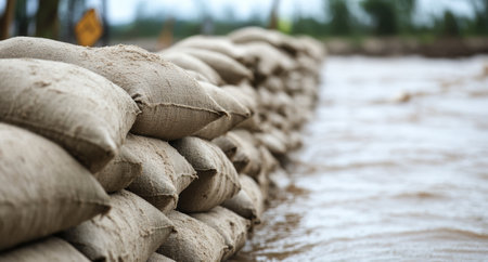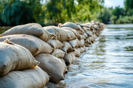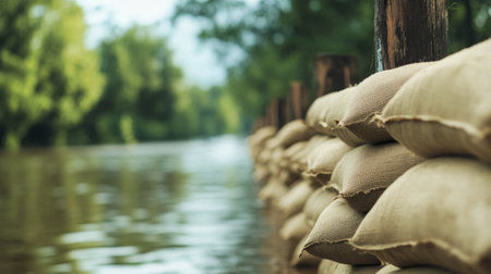 Detailed view of sandbag barrier by river to prevent flooding, symbolizing resilience, disaster preparedness and climate change response.