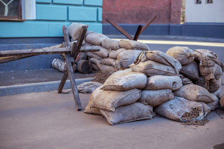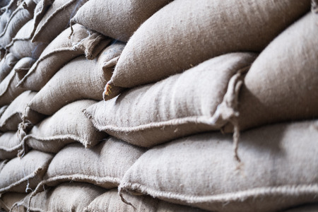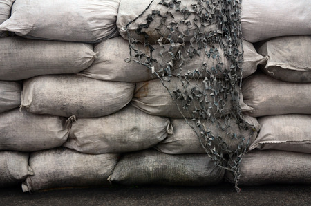 Shelter in a soldier's battle. War and fighting on the battlefield. Pile of sandbags barrier to prevent flooding. Warfare background with copy space. Military mission.