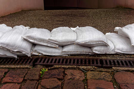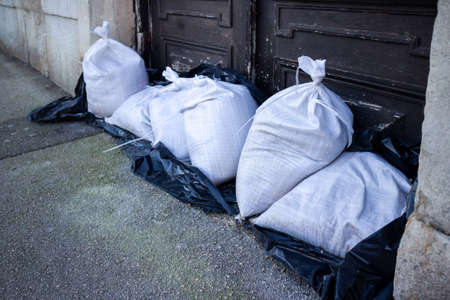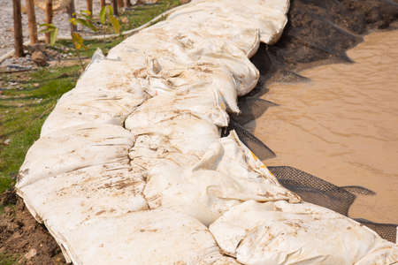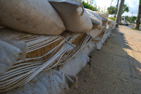 Sandbag to prevent flooding in the rainy season, preventive concept.