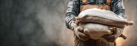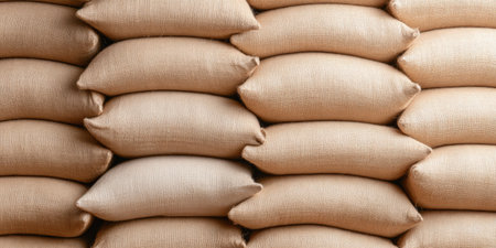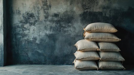 Bags of grain stacked in a storage area, creating a rustic atmosphere, earthy tones creating a warm, agricultural feel, ideal for farming or food industry concepts