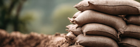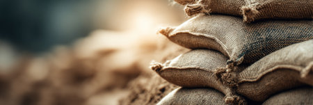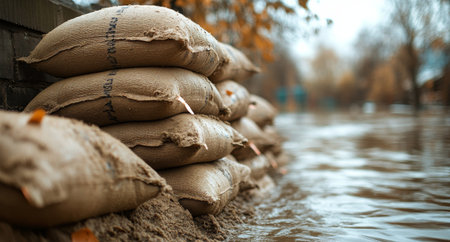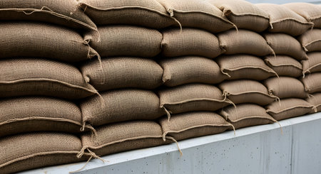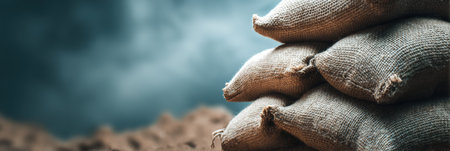 folded sandbags creating a protective barrier against floods and hurricanes, set against a natural backdrop, subject positioned at the top with generous copy space below for photos.