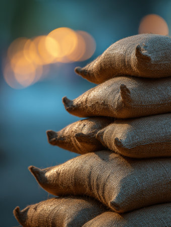Stacked sandbags form a pyramid against a softly blurred background, illuminated by gentle upper margin light, creating a serene evening atmosphere