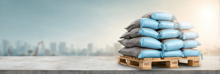 Stack of cement bags arranged neatly on a wooden pallet, set against a clean industrial backdrop with a city skyline visible under daylight.