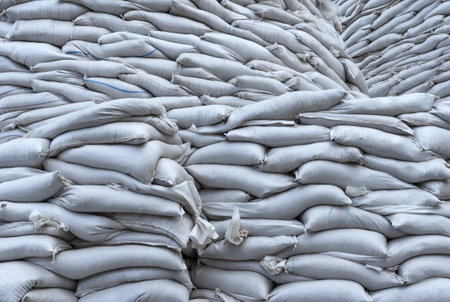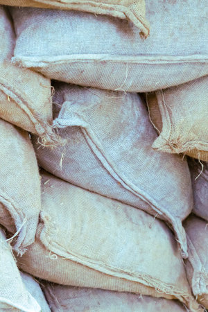 Background of many sandbags. Protective sandbag barricade for military use, many Sandbags for flood protection, closeup