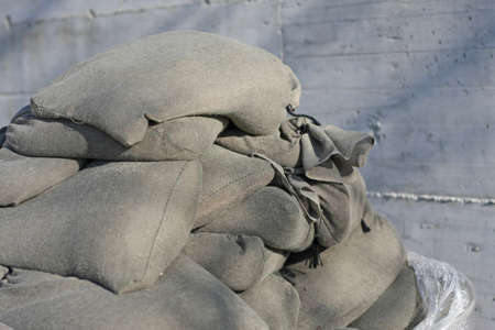 Background of lying gray sandbags. Sandbag flood protection wall texture. Bags to strengthen the defensive structure during the battle.