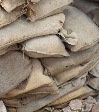Background of many dirty sand bags for flood defense. Protective sandbag barricade for military use. Handsome tactical bunker