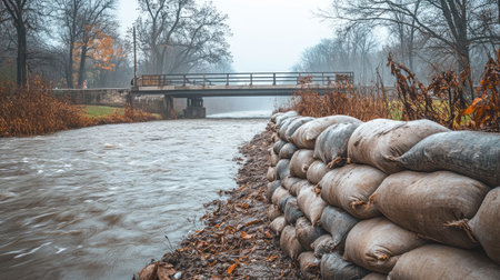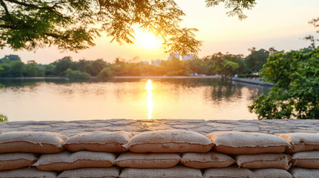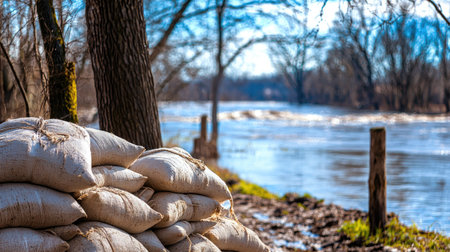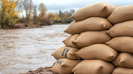 A stack of sandbags rests by a riverbank, ready to mitigate rising floodwaters. The serene scene captures nature's beauty and the urgency of flood prevention.