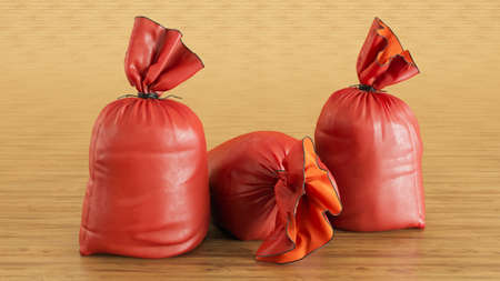 red Money bag over wooden background, Cash, Symbol of financial savings, 3D render