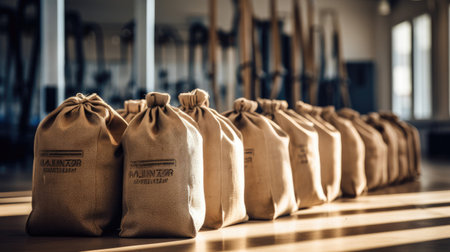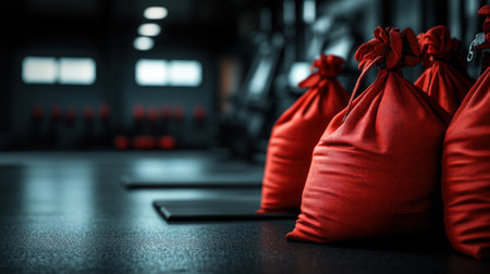 Vibrant red sandbags lined up in a modern gym, showcasing fitness equipment and a dark, focused training environment.