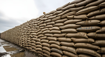 A long and high wall constructed from thousands of stacked burlap sandbags stretches into the distance. This formidable barrier is designed for flood control or as a military fortification, symbolizing protection, defense, and resilience against threats.
