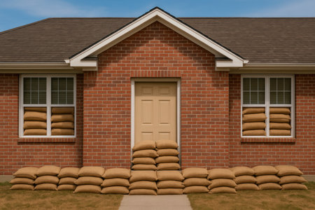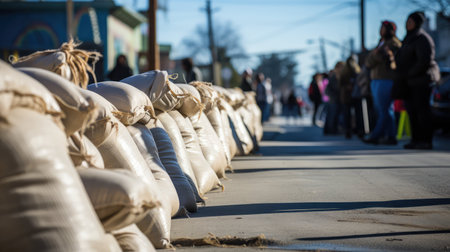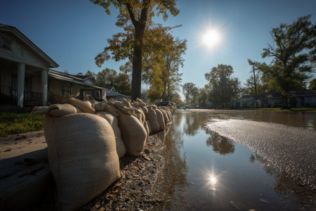 Residents in a neighborhood have placed sandbags along the street to prevent flooding. Water surrounds the bags, reflecting sunlight on a clear day, indicating severe weather conditions.