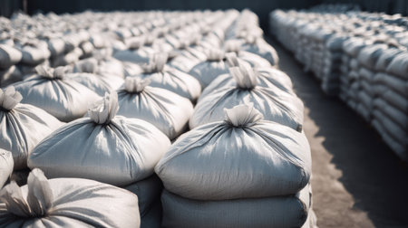 This image showcases a neatly arranged bulk storage of large gray bags filled with sand or soil at a construction site, ideal for landscaping and building projects.