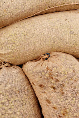 old hemp sacks containing coffee bean in warehouse. stacked sacks in storehouse.