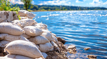A stack of sandbags rests along the water's edge, glistening under a bright blue sky. The image captures a serene scene of nature, reflecting safety and environmental management.