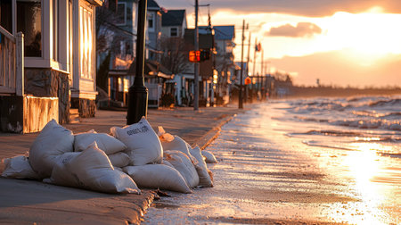 A serene sunset casts a warm glow over sandbags arranged along a flooded shoreline in a coastal town. The scene captures the tension of nature and community effort.