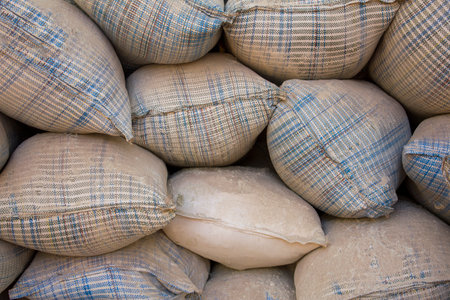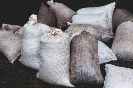 Hemp sacks full of harvest products accumulated on the ground. Agriculture, business concept