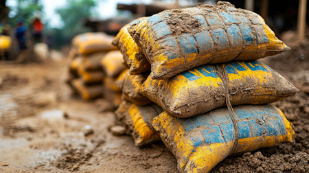 Sandbags are stacked in a pyramid formation on a construction site, providing a strong base for various activities in a blurred and softly lit background