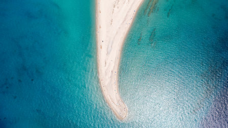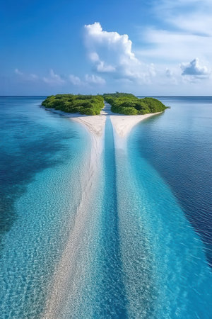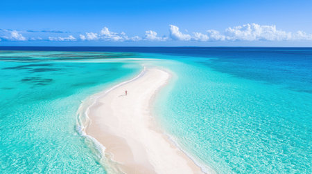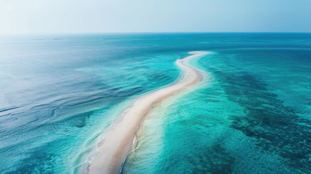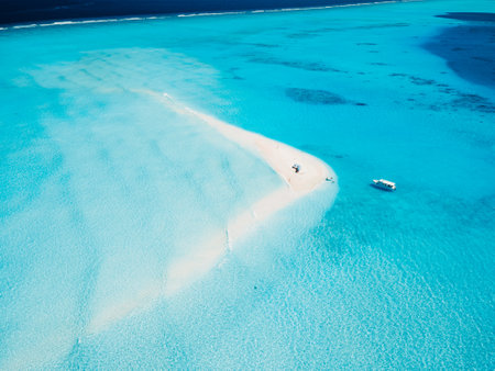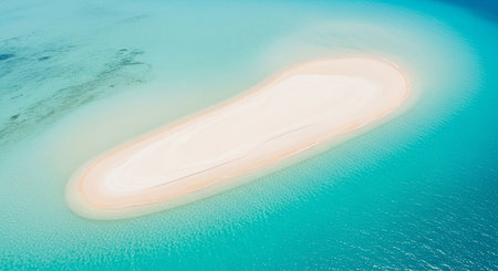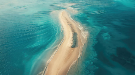 Keywords: showing aerial view of a small, elongated sandbar island surrounded by vibrant turquoise and light blue tropical ocean waters keywords:...
