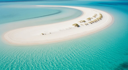 An aerial perspective reveals a sandbar forming a distinct question mark shape within the clear, shallow turquoise ocean water, highlighting its...